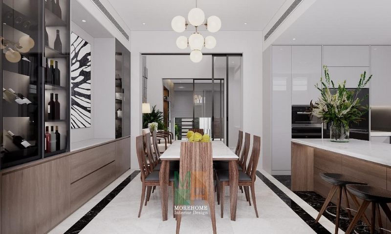 Phòng khách biệt thự Vinhomes Greenbay được trang trí sang trọng bằng sản phẩm kệ trang trí kệ decor làm bằng gỗ óc chó.